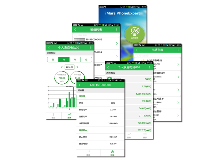 WinExpert和PhoneExpert是为监控光伏并网发电系统而设计的专用监控软件,用户可以用电脑或智能手机与iMars逆变器通讯。WinExpert和PhoneExpert可以为用户呈现和记录单台iMars逆变器以及整个光伏发电系统的实时参数、运行状态、历史数据和警告信息。
