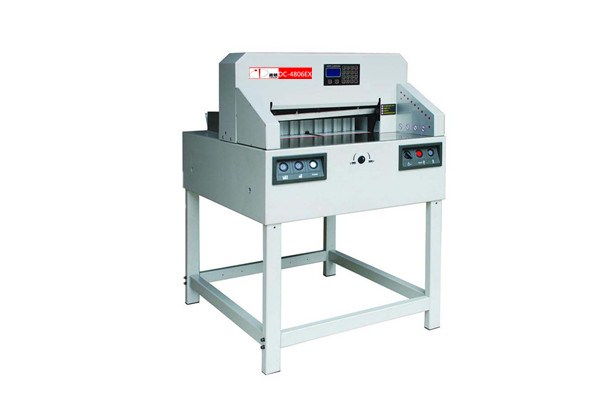 DC-4806EX /PX电动数控/程控切纸机,采用斜刀切纸专利技术,刀架间隙可调专利技术,提高裁切精度±0.2mm 离心式压纸驱动专利技术,有效解决电动机器压纸抱死。\n双导杆推纸技术装置,保证推纸精度,使用更平稳 。红外光栅安全保护电路设计,前红外安全保护设计,后护罩防护,符合CE标准,操作更安全。 外观专利设计,简约设计,工艺精湛,适宜图文快印办公环境.